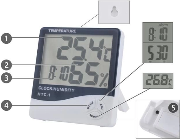 Tato moderní digitální meteostanice HTC-1 kombinuje přesné měření vnitřní teploty a relativní vlhkosti se zobrazením času. Velký, kontrastní LCD displej zajišťuje okamžitou a čitelnou kontrolu klimatu v místnosti, což pomáhá k lepšímu větrání, pohodlí i péči o zdraví a domácnost.