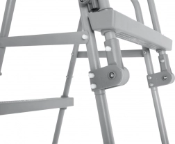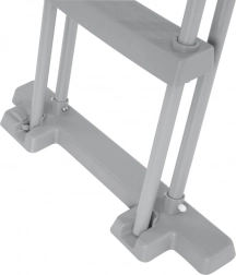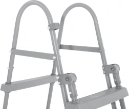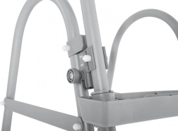 Rám z kovu s antikorozní úpravou v šedém nátěru odolá dlouhodobému venkovnímu používání, plastové stupně s protiskluzovým reliéfem minimalizují riziko uklouznutí. Pro vyšší bezpečnost lze žebřík odklopit směrem nahoru, aby děti bez dozoru nemohly do bazénu.