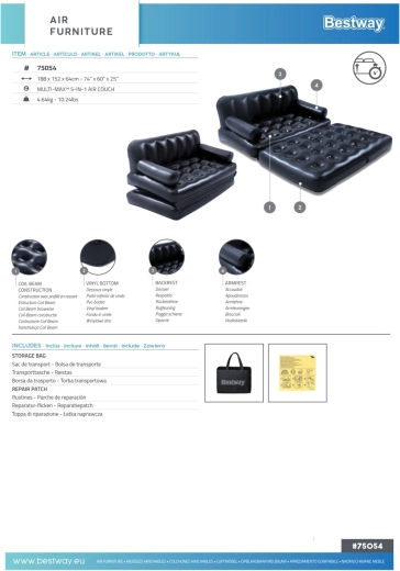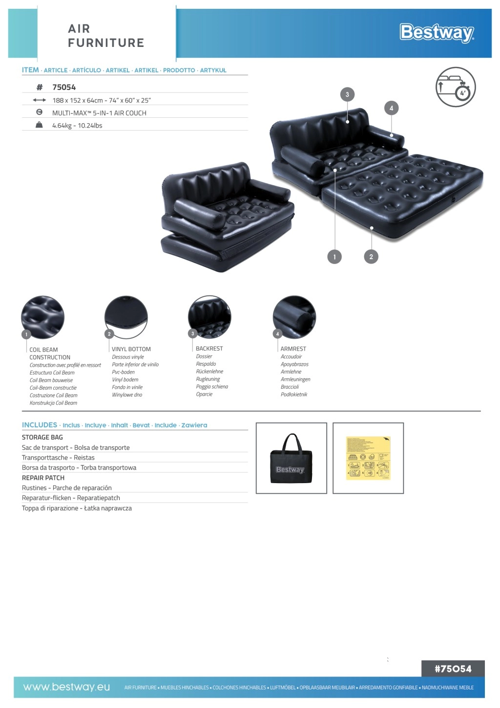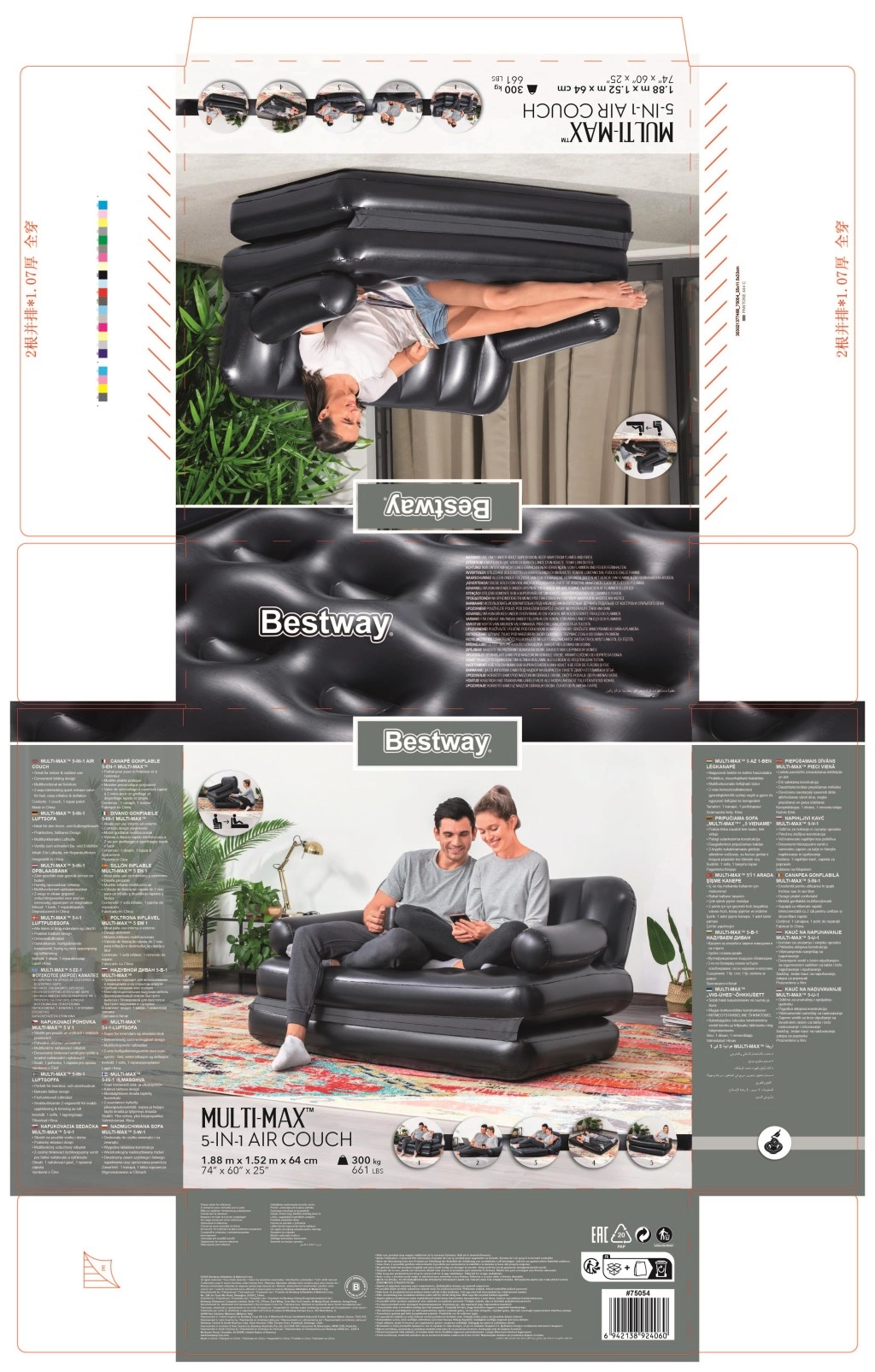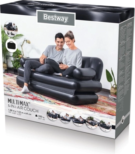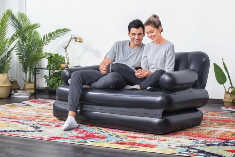 Univerzální nafukovací pohovka a postel 5v1 od značky BESTWAY nabízí pohodlné sezení i spaní pro dva. Díky odolnému PVC, stabilní konstrukci Coil Beam a rychloupouštěcímu ventilu ji snadno nafouknete, přestavíte na lenošku či dvojlůžko a po použití rychle vyfouknete. Ideální pro interiér, hosty i dočasné spaní.