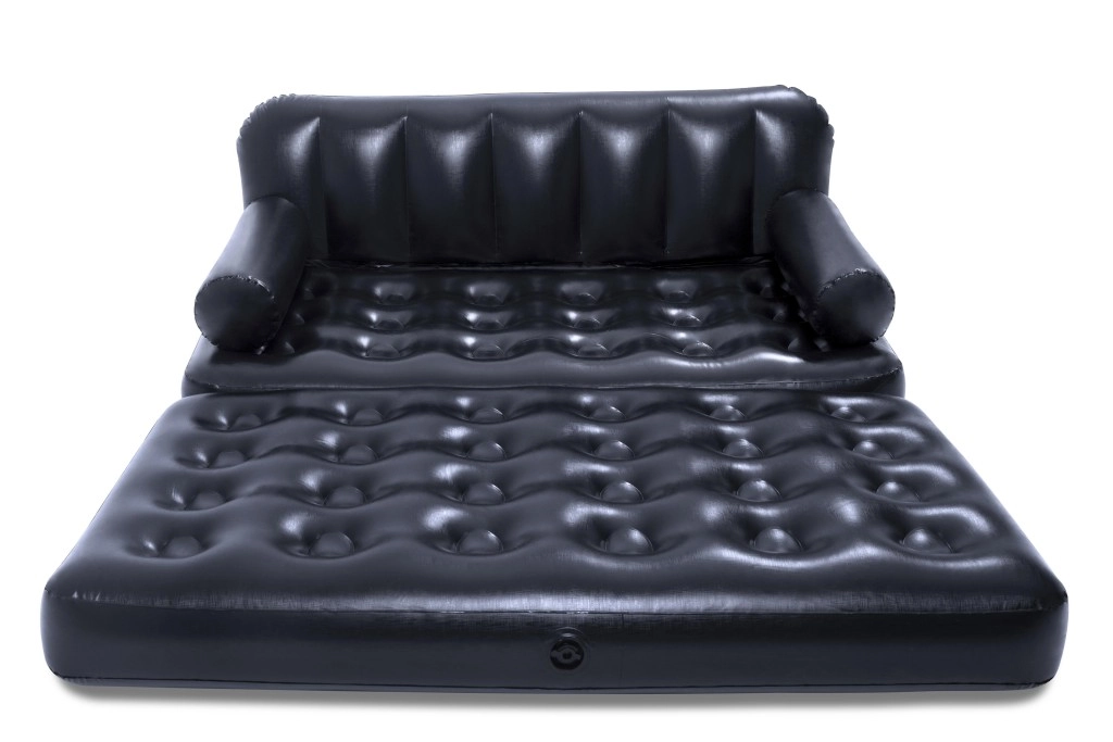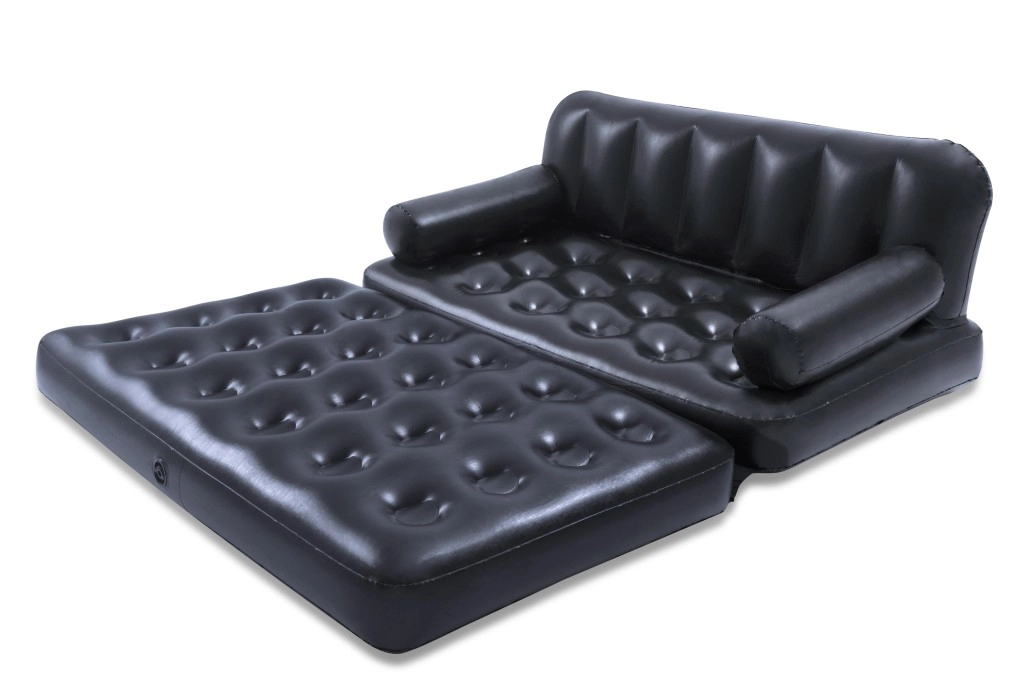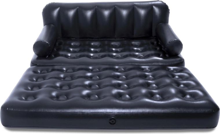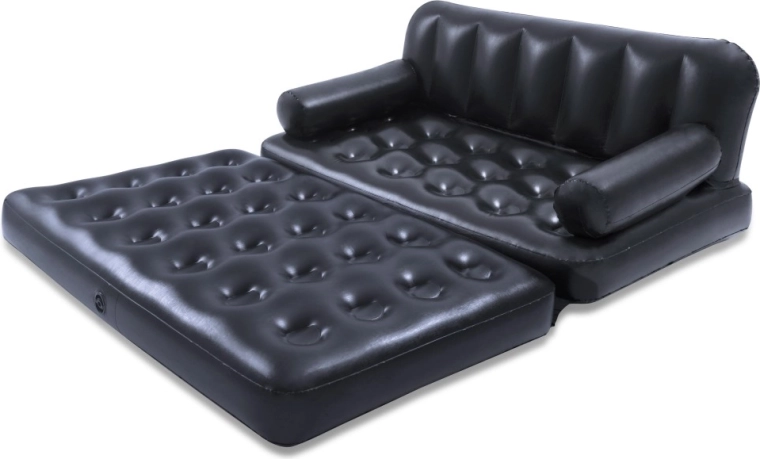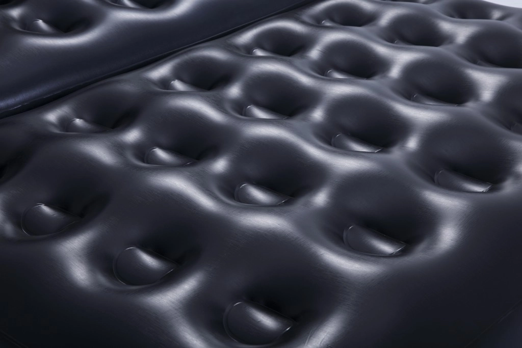 Tato multifunkční nafukovací pohovka 5v1 kombinuje pohodlí, praktičnost a kompaktní rozměry. Slouží jako dvojmístná pohovka, relaxační křeslo, lenoška i dvojlůžko se stabilní oporou. Měkký horní povrch a přiložené válcové opěrky zvyšují komfort při sezení i spánku.