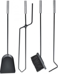 Vše po ruce: kleště, lopatka, kartáč, hák/poker a stabilní stojan pro přehledné uložení a rychlý přístup při obsluze krbu.