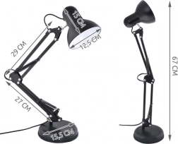 Tato elegantní černá stolní lampa je perfektním doplňkem pro váš pracovní prostor díky svému retro designu. S kovovou konstrukcí poskytuje pevnost a výdrž, zatímco její těžká základna zabraňuje převrácení. Je vybavena nastavitelným ramenem se zabudovanými pružinami, což umožňuje snadné přizpůsobení výšky a směru světla přesně podle vašich potřeb.