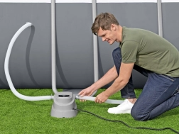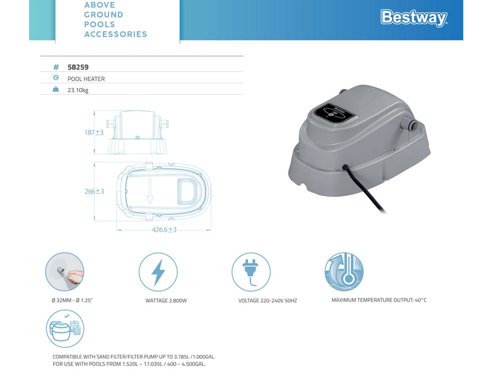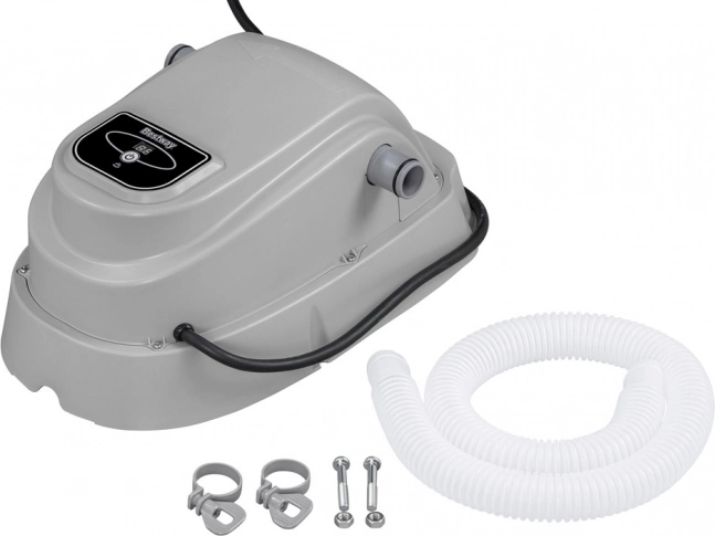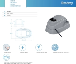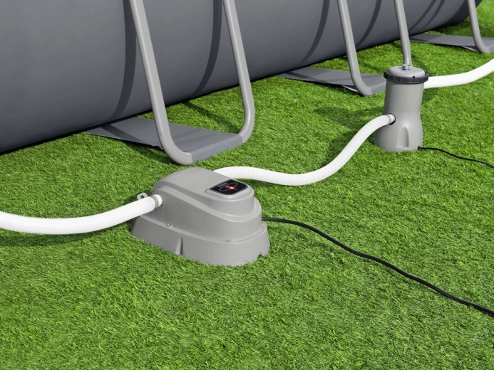 Instalace je snadná – ohřívač jednoduše připojíte k filtračnímu systému bazénu. Zařízení je určeno pro nadzemní bazény o objemu 1 520–17 035 l a průtok čerpadla do 3 785 l/h. Maximální teplota je 40 °C (dosažitelná dle vstupní teploty vody a okolí). Robustní konstrukce a dlouhý napájecí kabel 3,5 m usnadňují umístění a provoz.