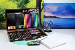 Všechny výtvarné potřeby jsou úhledně uspořádány v rozkládacím dřevěném kufříku s přihrádkami, takže máte vždy rychlý a snadný přístup ke všemu, co potřebujete.