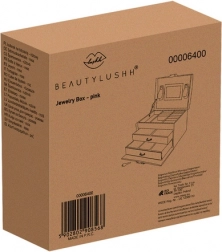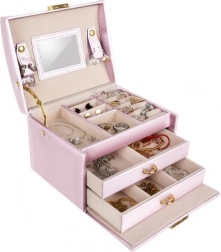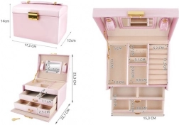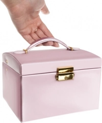 Elegantní růžová šperkovnice s 20 přihrádkami, 2 zásuvkami a zámkem na klíč udrží vaše poklady v bezpečí a perfektním pořádku. Má měkké vystlání proti poškrábání, praktické rolky na prsteny, pásky se cvoky na náramky a řetízky, integrované zrcátko a horní madlo pro snadné přenášení.