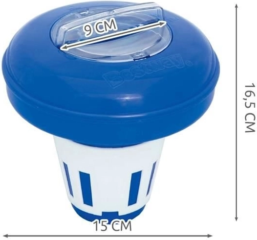 Dávkovač chloru Bestway má speciální regulační kroužek, který umožňuje přesně kontrolovat uvolňování chemikálií. Bezpečně dávkuje chlorové tablety různých velikostí.