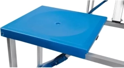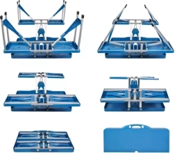 Stůl tvoří po složení praktický kufřík s madlem. Rozložení i složení je rychlé a bezpečné díky aretačním zámkům.