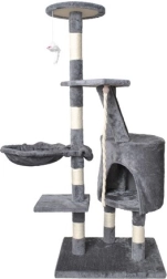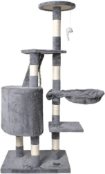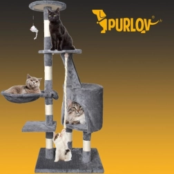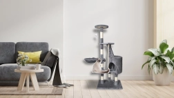 Nabízí více úrovní pro kočky, včetně útulného domečku, schůdků a zavěšené hračky, která aktivizuje kočičí zvědavost.