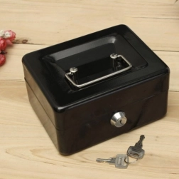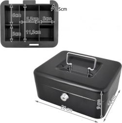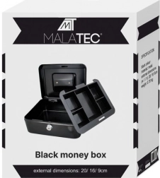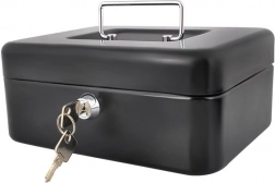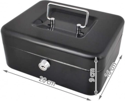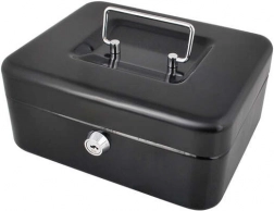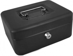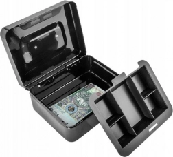 Praktická kovová pokladnička ISO TRADE v elegantní černé barvě bezpečně uloží hotovost i drobné cennosti. Nabízí zámek na klíč, vyjímatelnou přihrádku na mince se skrytým prostorem pod ní a pevné kovové provedení s pohodlným sklopným madlem. Kompaktní rozměry 20 × 16 × 9 cm se hodí do domácnosti, kanceláře i hotelového pokoje.