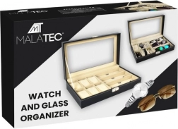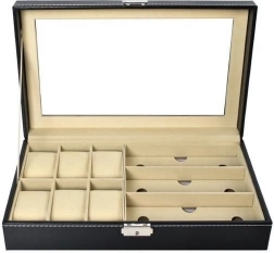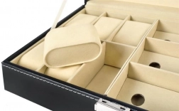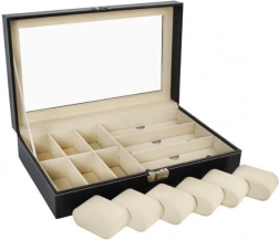 Elegantní černý organizér s bílým prošíváním kombinuje reprezentativní vzhled a praktičnost. Prosklené víko umožňuje přehlednou prezentaci obsahu, zatímco oddělené přihrádky s měkkou výstelkou chrání hodinky, brýle i další šperky před poškrábáním a nechtěným kontaktem.