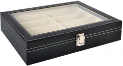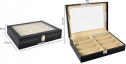 Tento kvalitní box na brýle od značky SOULIMA spojuje elegantní design s praktickým uspořádáním. Černá ekokůže s bílým prošitím působí reprezentativně, zatímco světlá vnitřní vložka přehledně ukáže každý pár. Skleněné víko slouží k rychlému náhledu i k dekorativní expozici.