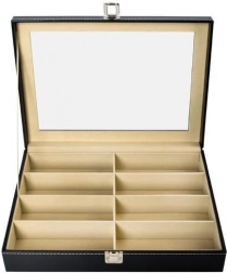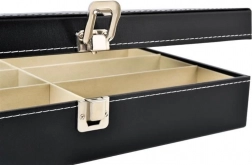Uvnitř najdete 8 samostatných přihrádek s vyššími přepážkami, které brání nechtěnému kontaktu a poškození. Měkká flanelová výstelka chrání před oděrkami, praktická tkanice drží víko v ideální poloze a kovový patent zajišťuje bezpečné uzavření při přesunu.