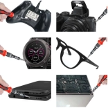 Široký výběr bitů a příslušenství pokryje servis smartphonů, tabletů, notebooků, kamer, herních ovladačů, ale i práce v hodinářství a optice. Ergonomická rukojeť s protiskluzovou gumou a flexibilní prodloužení usnadňují práci i v úzkých prostorech.