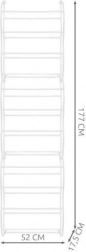 SPECIFIKACE - počet párů bot: 36; počet polic: 12; materiál: ABS + ocel; maximální zatížení: 25 kg; rozměry (délka/šířka/výška): 17,5/52/177cm; hmotnost: 750g; hmotnost s obalem: 1,15 kg.