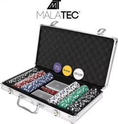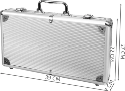 Kompletní pokerový set pro domácí turnaje i společenské večery: 300 profesionálních žetonů s kovovým jádrem, 2 balíčky karet, 5 kostek, žetony DEALER/SMALL BLIND/BIG BLIND a odolný hliníkový kufřík s polstrovaným interiérem pro bezpečný transport.
