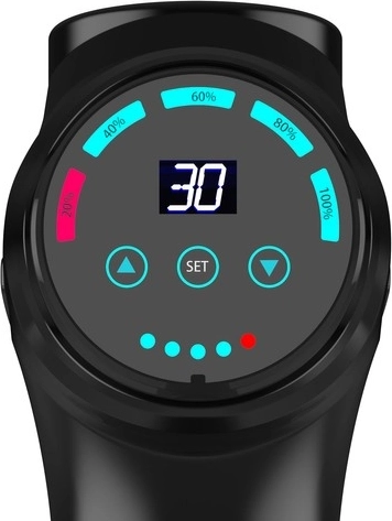 Tato masážní pistole má až 30 úrovní intenzity masáže. Jedná se o velmi velký rozsah, který vám umožňuje individuálně přizpůsobit rychlost svalům, na kterých má být použit. Intenzita práce se mění pomocí citlivého dotykového panelu, stačí se ho jemně dotknout.