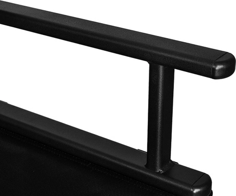 Pevná hliníková konstrukce, odolná tkanina Oxford 600D a podnožka pro oporu nohou zajišťují bezpečné sezení s nosností až 140 kg.