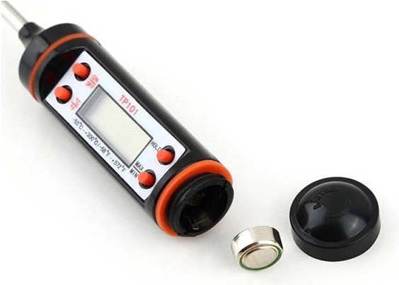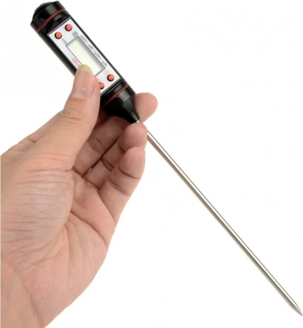 Praktický digitální kuchyňský teploměr s lcd displejem a nerezovou sondou pro rychlé a přesné měření teploty masa, tekutin, olejů i vína. Nabízí rozsah -50 až +300 °C, přesnost 1 °C, funkci HOLD, paměť posledního měření a automatické vypnutí. Snadno čitelné zobrazení °C/°F, napájení baterií LR44 (součást balení).