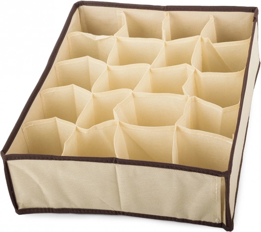 Tento béžový organizér je ideální pro všechny typy zásuvek nebo může být umístěn na dno skříní. Umožňuje snadno a prakticky uspořádat nejen spodní prádlo, ale i ponožky, kravaty nebo pásky, a tak udržet pořádek v domě. Díky vyztuženým kartonovým stranám a prodyšnému materiálu je tento organizér pevný a zároveň snadno udržovatelný v čistotě.