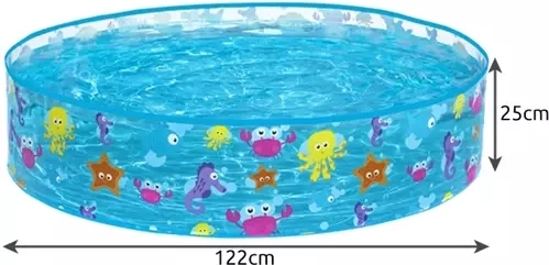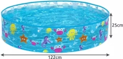 Specifikace bazénu zahrnují kapacitu 277 litrů a rozměry 122 cm x 25 cm, což je ideální pro malé děti. Výrobek váží pouhých 950 g, takže je lehce manipulovatelný a přenosný. Součástí balení je i vodotěsná opravná záplata, umožňující rychlé opravy, i když je bazén naplněn vodou.