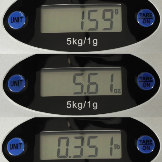 Stojan je vyroben z tvrzeného skla odolného proti poškození a snadno čistitelného, o tloušťce 4 mm a průměru 15 cm. Je vybaven funkcí odpočítávání hmotnosti nádoby - tlačítko TARE. Přesnost 1 g. Váha se automaticky vypne, pokud se nepoužívá. Velký, snadno čitelný pětimístný displej LCD.