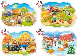 Tento set 4v1 nabízí čtyři samostatné puzzle v jednom balení, ideální pro postupné zvyšování náročnosti. Po složení vznikají barevné obrázky s motivy farmy, zvířátek, traktorů a dětských her, každý o rozměru 28 × 19,5 cm. Kvalitní tisk a pevné dílky zaručují dlouhou životnost a radost z opakovaného skládání.