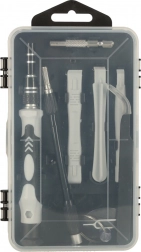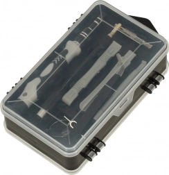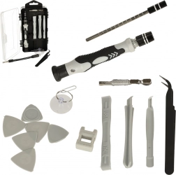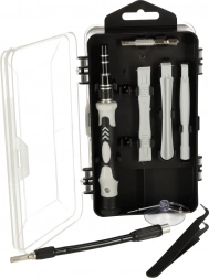 Rukojeť, adaptéry, páčidla, pęseta, přísavka, klíček na SIM a magnetizér/demagnetizér – vše potřebné pro bezpečné rozborky a opravy.