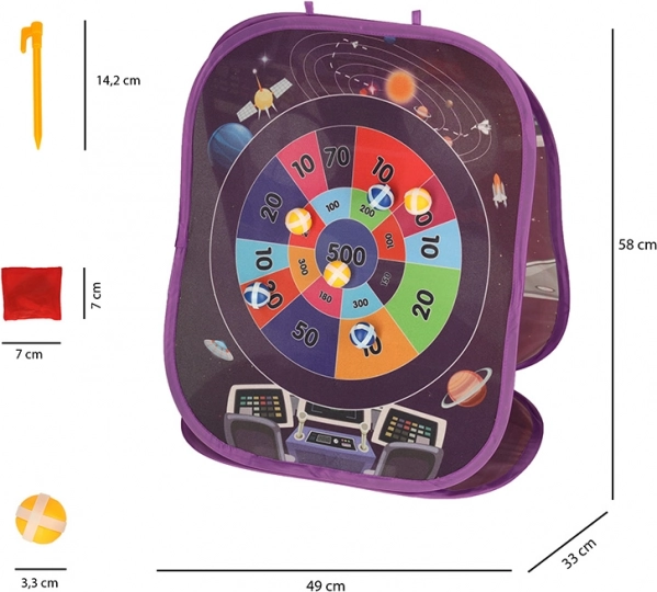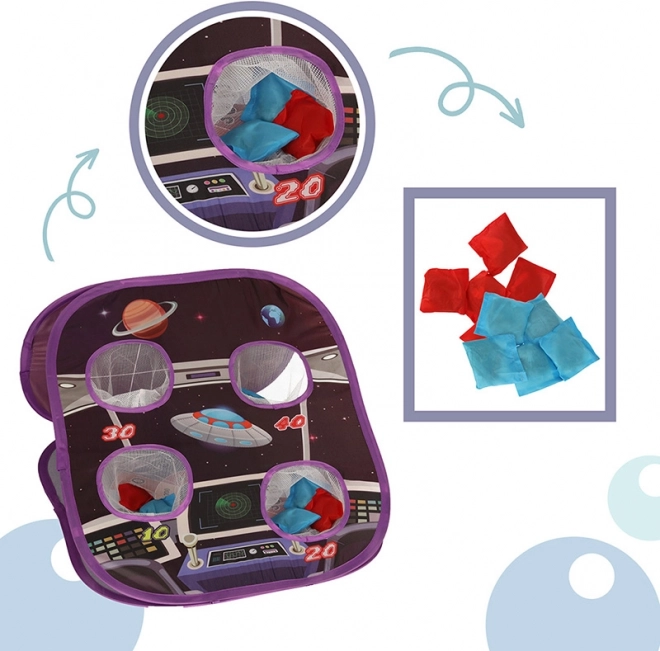 Oboustranná hračka s vesmírným motivem přináší vzrušení a zábavu dětem jak doma, tak na zahradě. K dispozici jsou dva typy cílů: jedna strana svítivé kruhové desky přitahuje styčné plochy měkkých míčků na suchý zip, zatímco druhá strana vyžaduje, aby děti trefily otvory sáčkem.