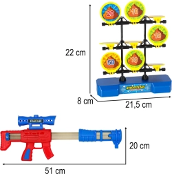 Set rozvíjí jemnou motoriku, koordinaci oko–ruka i plánování dráhy letu. Díky „lunetě“ pro lepší míření si děti rychle osvojí přesnější střelbu. Odolné plastové provedení zaručí hodiny bezstarostné zábavy a soutěží.
