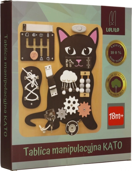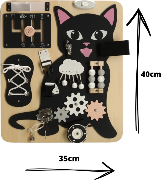 Kombinace černého koťátka se světlými dřevěnými detaily přitahuje pozornost a udržuje dítěti zábavu dlouhé hodiny.