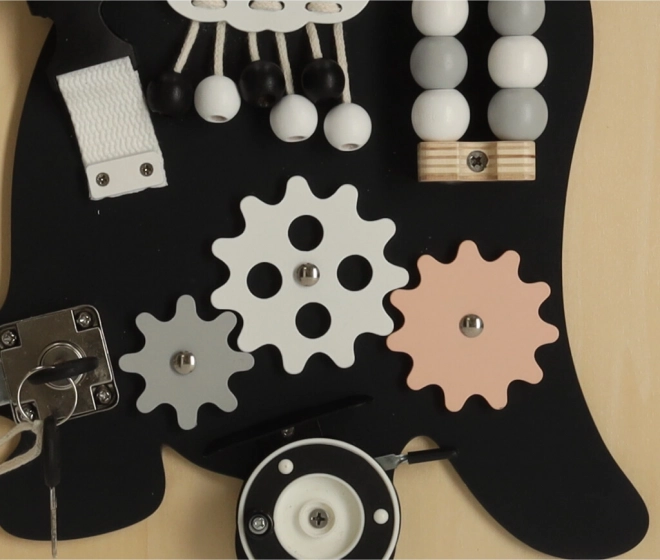 Pomocí interaktivních prvků jako jsou převodovky, zámky a tkaničky, se děti učí jemné motorice a zlepší si preciznost pohybů rukou.