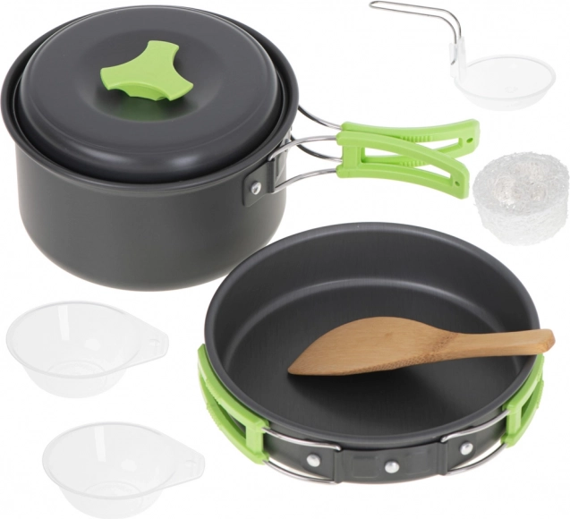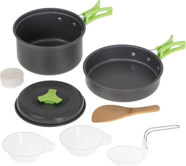 V sadě najdete pánvičku, hrnec a pokličku, které jsou vyrobeny z hliníku pro rychlé a efektivní vaření. Dvě misky pro sdílení jídla, dřevěná lopatka pro míchání a naběračka dělají přípravu teplých jídel jednoduchou a pohodlnou.