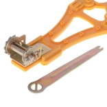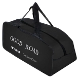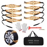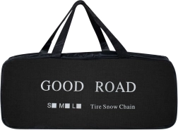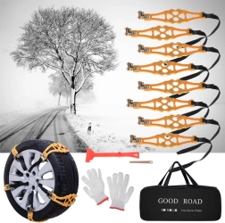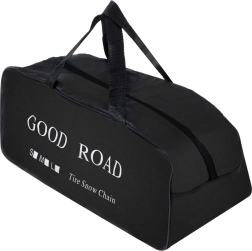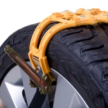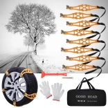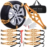 Montáž zvládnete během chvilky: provlečete popruh skrz disk, utáhnete kovovou přezkou a opakujete v několika bodech po obvodu pneumatiky. Sada je dodávána v odolné přenosné tašce a navíc obsahuje rukavice a škrabku na sklo pro pohodlné použití v terénu.