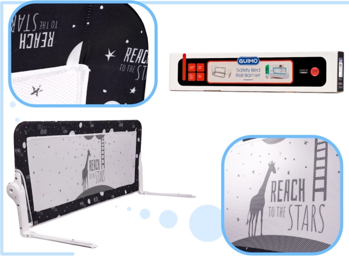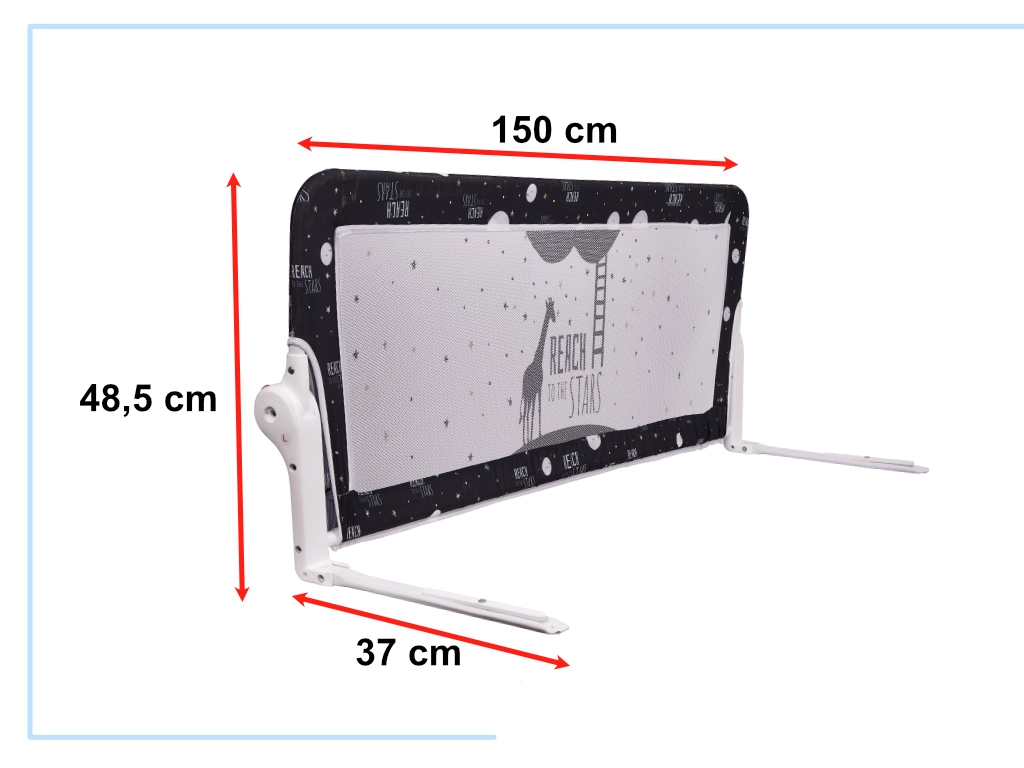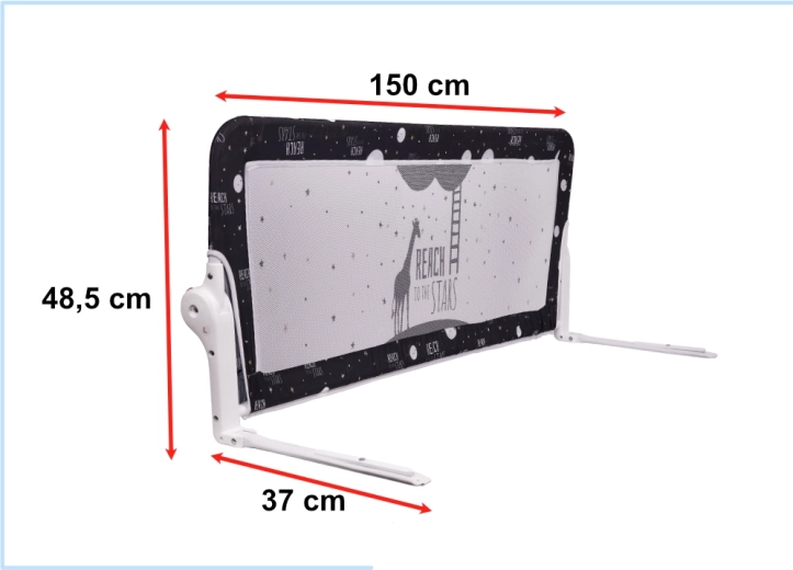 Instalace je rychlá: stačí vložit rám do textilního návleku, zasunout podpěrné nohy pod matraci a je hotovo – bez vrtání a nářadí. Díky skládacím pantům zábranu snadno sklopíte pod úroveň matrace pro pohodlné ustýlání nebo uložení. Prodyšná síťka je příjemná na dotek a zároveň bezpečně chrání před pádem.