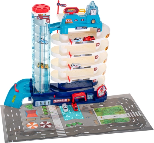 Velké vícepatrové parkoviště pro děti nabídne až 5 úrovní parkování, elektrický i manuální výtah, světelné a zvukové efekty a navíc 8 kovových/plastových autíček a herní podložku s městem. Skvělá hračka pro rozvoj fantazie, jemné motoriky a logického uvažování.