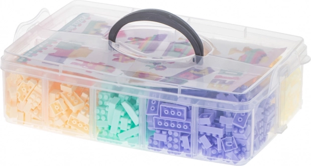 Průhledný box s přihrádkami umožňuje snadné ukládání a třídění bloků podle barev.