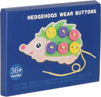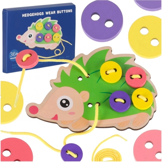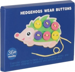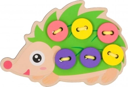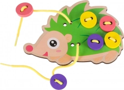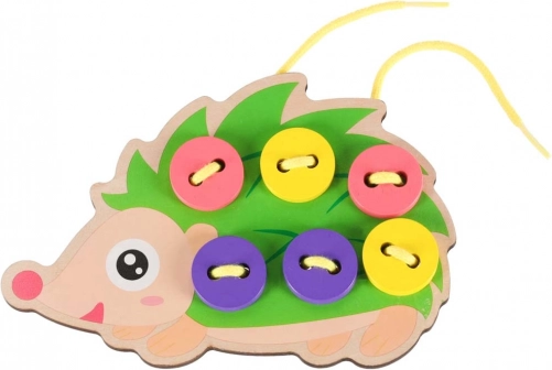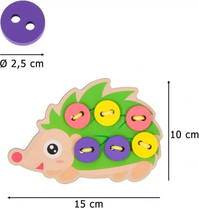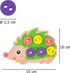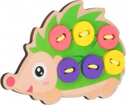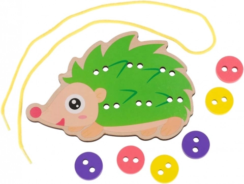 Tento provlékací ježek je ideální pomůcka pro první krůčky ve šněrování a „šití“. Děti provlékají šňůrku skrz otvory a připevňují barevné knoflíky na „ostny“ ježka. Veselé, syté barvy přirozeně lákají ke hře a učí rozlišovat barvy i tvary.
