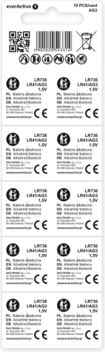 Alkalické knoflíkové baterie everActive LR41 (LR736/AG3) 1,5 V. Spolehlivé pro hodinky, kalkulačky a měřicí přístroje. Balení 10 ks v blistru.