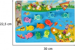 Tato kreativní montessori sada nabídne dětem hned tři způsoby hraní: lovení rybiček na magnet s prutem, vkládání rybiček s čísly do správných otvorů a trénink jemné motoriky s včelkami pomocí pinzety. Pestrobarevné prvky motivují ke hře, zatímco kvalitní dřevěné provedení se zaoblenými hranami zajišťuje bezpečnost.