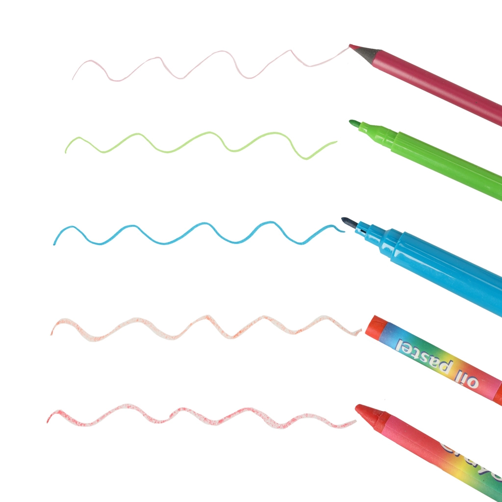 Od fixů přes pastelky a voskovky až po olejové pastely a akvarely – tato sada pokryje všechny výtvarné techniky. Každý nástroj má své místo, nic se neztratí.