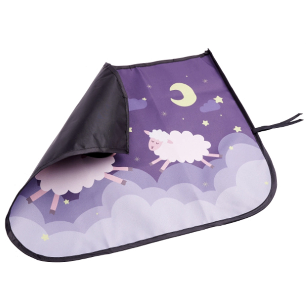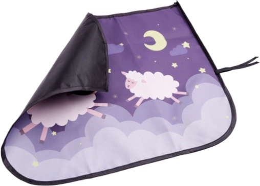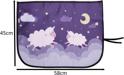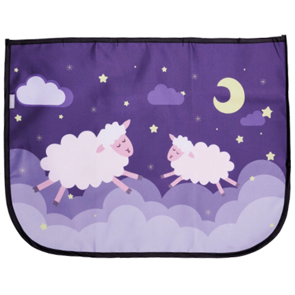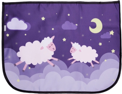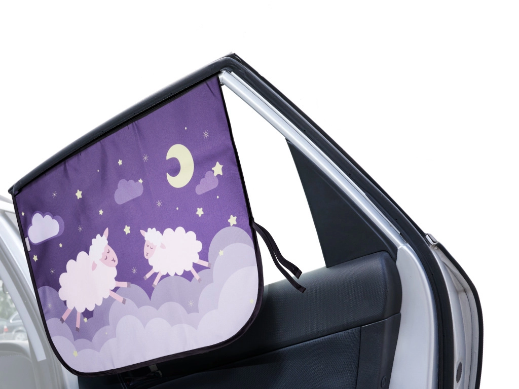 Stylová a funkční clona s motivem oveček chrání interiér vozu před přehříváním a děti před oslněním. Dvouvrstvé provedení zajišťuje vysokou úroveň zatemnění a příjemné přítmí pro odpočinek během jízdy.