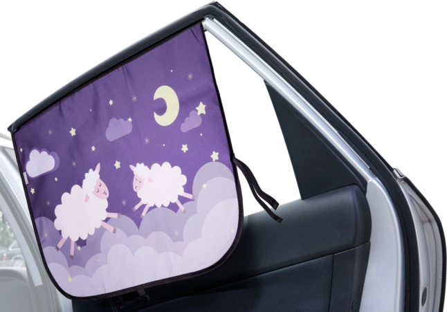 Magnetická clona na boční okno auta s motivem oveček. Dvouvrstvé zatemnění, 5 magnetů, ochrana před sluncem a UV, snadná instalace a údržba.
