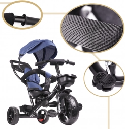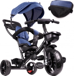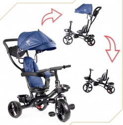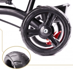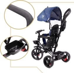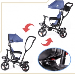 Pro maximální kontrolu je tu otočné sedadlo 360°, které umožní jízdu čelem k rodiči i po směru. Volné kolo (volnoběh) dovolí rodiči převzít pohon jedním přepínačem. Bezdušová kola zajišťují komfort jako nafukovací, ale bez starostí s tlakem a rizikem defektu. Nechybí třípolohová skládací stříška se sítí, odnímatelná vodicí tyč s pěnovým potahem a praktické úložné doplňky.