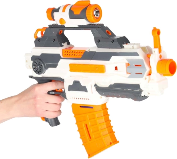 Postav si vlastní akční výbavu s modulárním blasterem 4v1. Základ tvoří velký karabinový blaster s taktickými lištami, posuvným okénkem pro odblokování zaseknuté šipky a sklopným hledím. V balení najdeš také dvě zásobníky, 30 pěnových šipek, odnímatelný tlumič hlavně a funkční svítilnu pro hru i za šera. Ideální pro venkovní akci i trénink přesnosti.