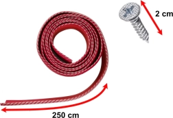 Obsah balení: lišta (2,5 m), 4× šroubek, čisticí ubrousek. Určeno pro hladké povrchy; životnost závisí na kvalitě nalepení.