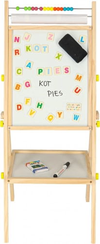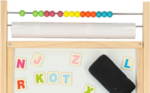 Oboustranná dětská tabule: křídová i bílá magnetická, s papírem a počítadlem. Včetně písmenek, fixu, houbičky a kříd. Ideální pro učení i hry.