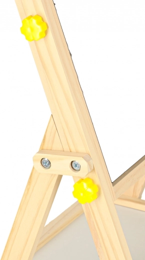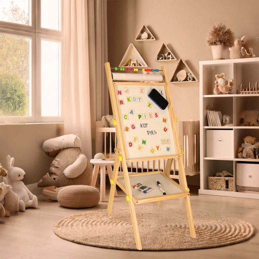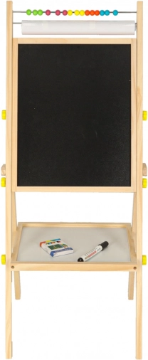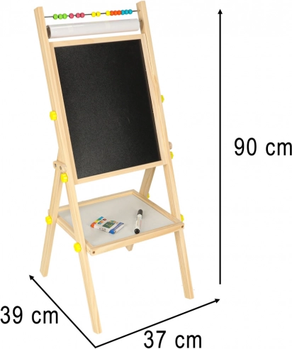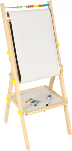 Praktická dětská tabule na dřevěném stojanu spojuje křídovou černou plochu a bílou magnetickou tabuli pro fixy. Je oboustranná a otočná, s horním dřevěným počítadlem a velkou rolí papíru pro kreslení a plakáty. Ideální pro učení, kreativní hry a kalambury, s odkládací policí na příslušenství.