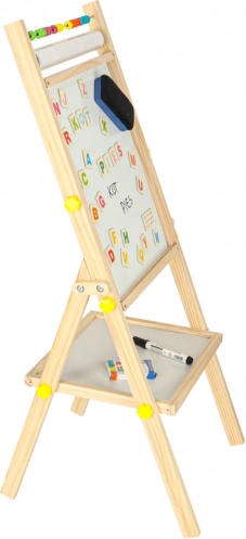 Součást balení: otočná tabule na dřevěném stojanu, 25 magnetických písmenek, suchý fix, houbička, 5× barevná křída.