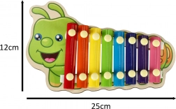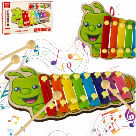 Veselý dětský xylofon ve tvaru housenky s osmi kovovými plíšky na dřevěném podstavci rozvíjí sluch, rytmus a koordinační dovednosti. Součástí jsou 2 dřevěné paličky, se kterými děti snadno zahrají první melodie a zároveň se učí barvy díky duhovému zbarvení kláves.