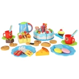Talířky, hrnečky, příbory a konvička doplňují dort i dezerty. Ideální pro společnou hru, servírování a učení se zdvořilosti a sdílení.